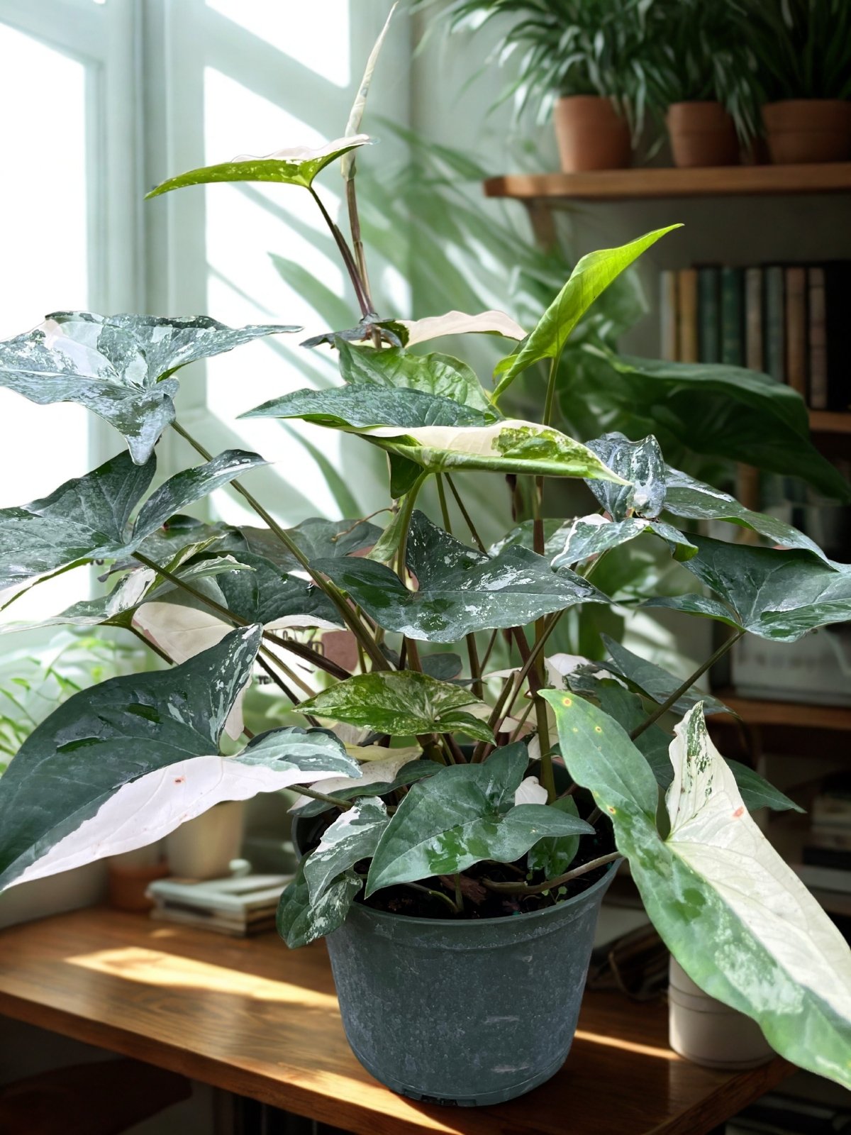 Syngonium Albo features arrow-shaped leaves with striking white variegation, bringing a bold, artistic touch to indoor plant collections.